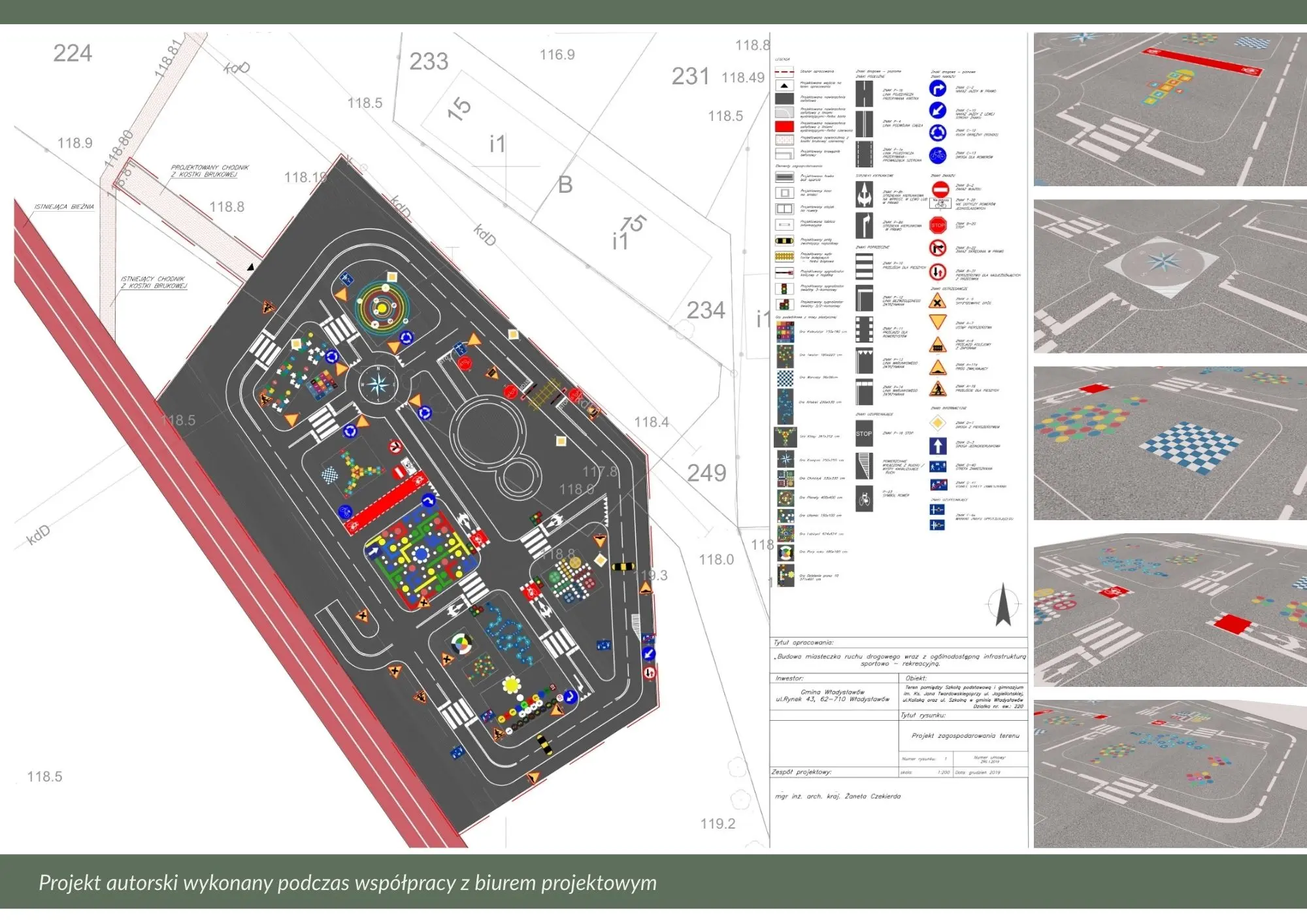 Zagospodarowanie terenu przy Szkole Podstawowej i Gimnazjum im. ks. Jana Twardowskiego we Władysławowie Koncepcja obejmowała projekt budowy miasteczka ruchu drogowego wraz z ogólnodostępną infrastrukturą sportowo-rekreacyjną. Założeniem było wprowadzenie dzieci i młodzieży w zasady bezpiecznego poruszania się w ruchu drogowym oraz naukę jazdy na rowerze. Zaprojektowano nawierzchnię asfaltową z oznakowaniem, ciągi komunikacyjne, mini infrastrukturę edukacyjną, strefę sportową oraz elementy małej architektury.
