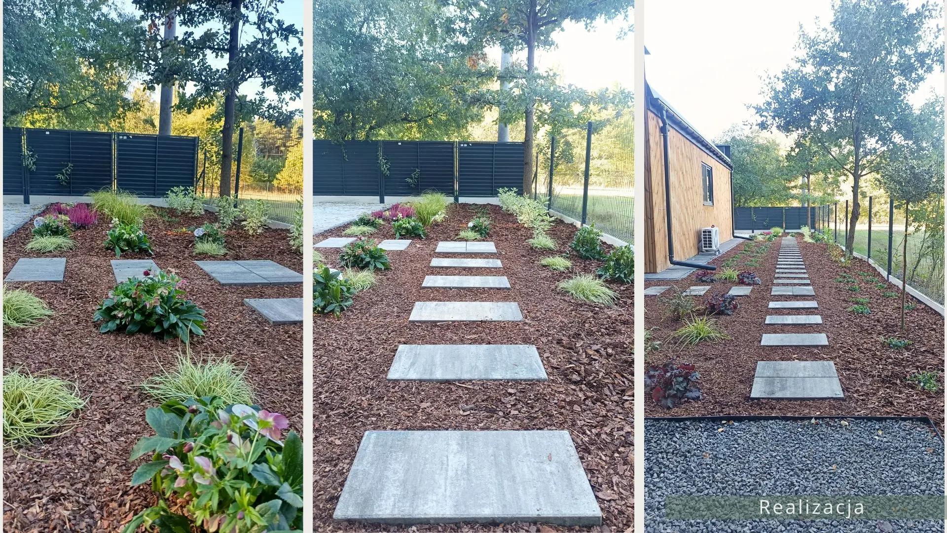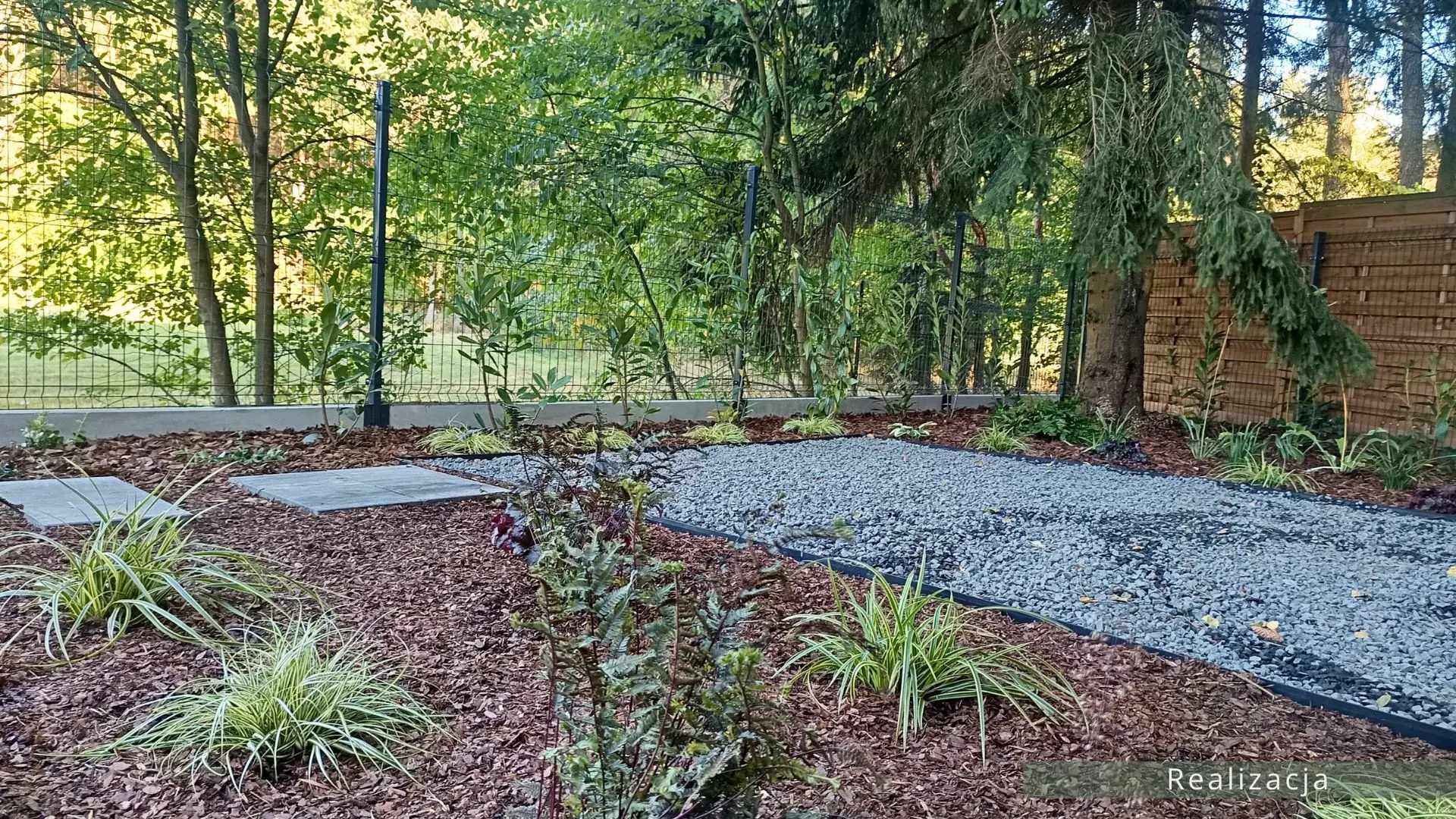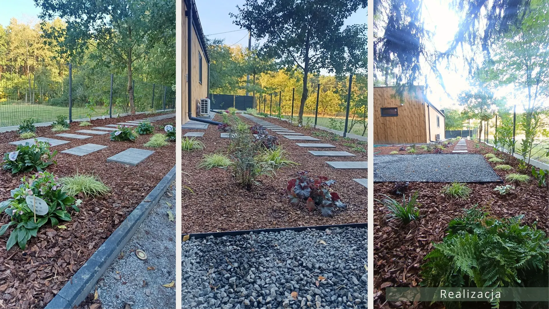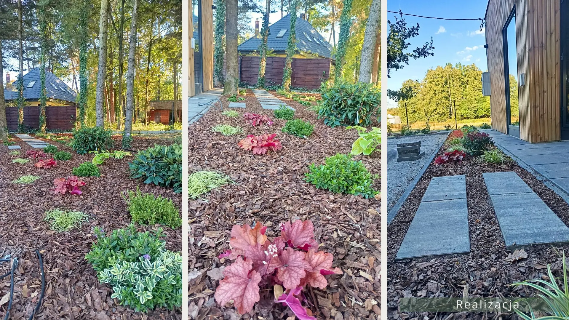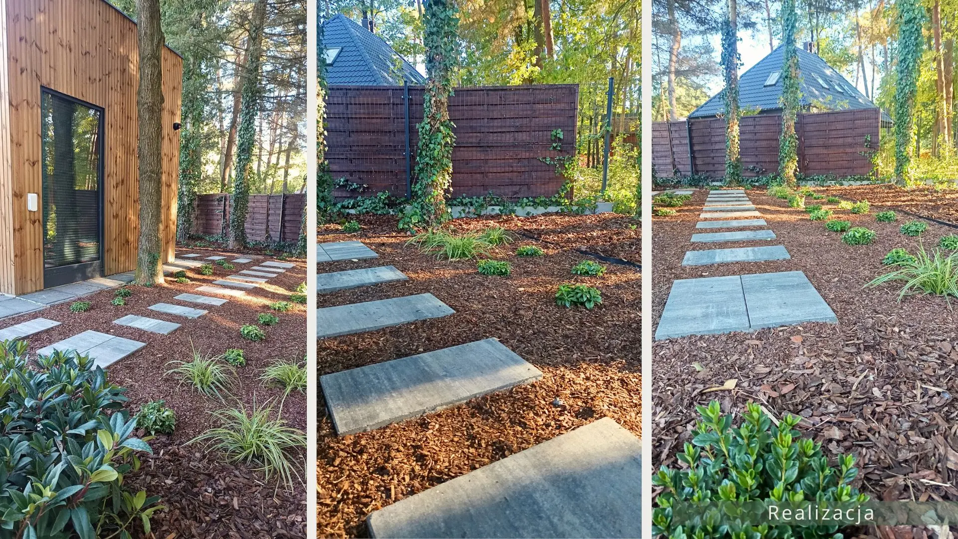 Projekt ogrodu nowoczesnego, leśnego o powierzchni około 210 m². W tym projekcie skupiono się na stworzeniu strefy tranzytowej wokół nowoczesnego budynku mieszkalnego. Zaprojektowano płyty betonowe układane na krok, zatopione w roślinności z wypełnieniem przestrzeni korą iglastą. Ze względu na duże zacienienie zrezygnowano z trawnika na rzecz rabat leśnych z gatunkami okrywowymi. Wydzielono strefę reprezentacyjną — rabatę przy tarasie wejściowym, w której dobrano rośliny wrzosowate, kwitnące oraz cieniolubne. W strefie tranzytowej, najbardziej nasłonecznionej, zaprojektowano krzewy owocowe, m.in. borówki i maliny. Całość harmonijnie współgra z otaczającym klimatem leśnym, wzbogaconym o subtelny akcent nowoczesności.