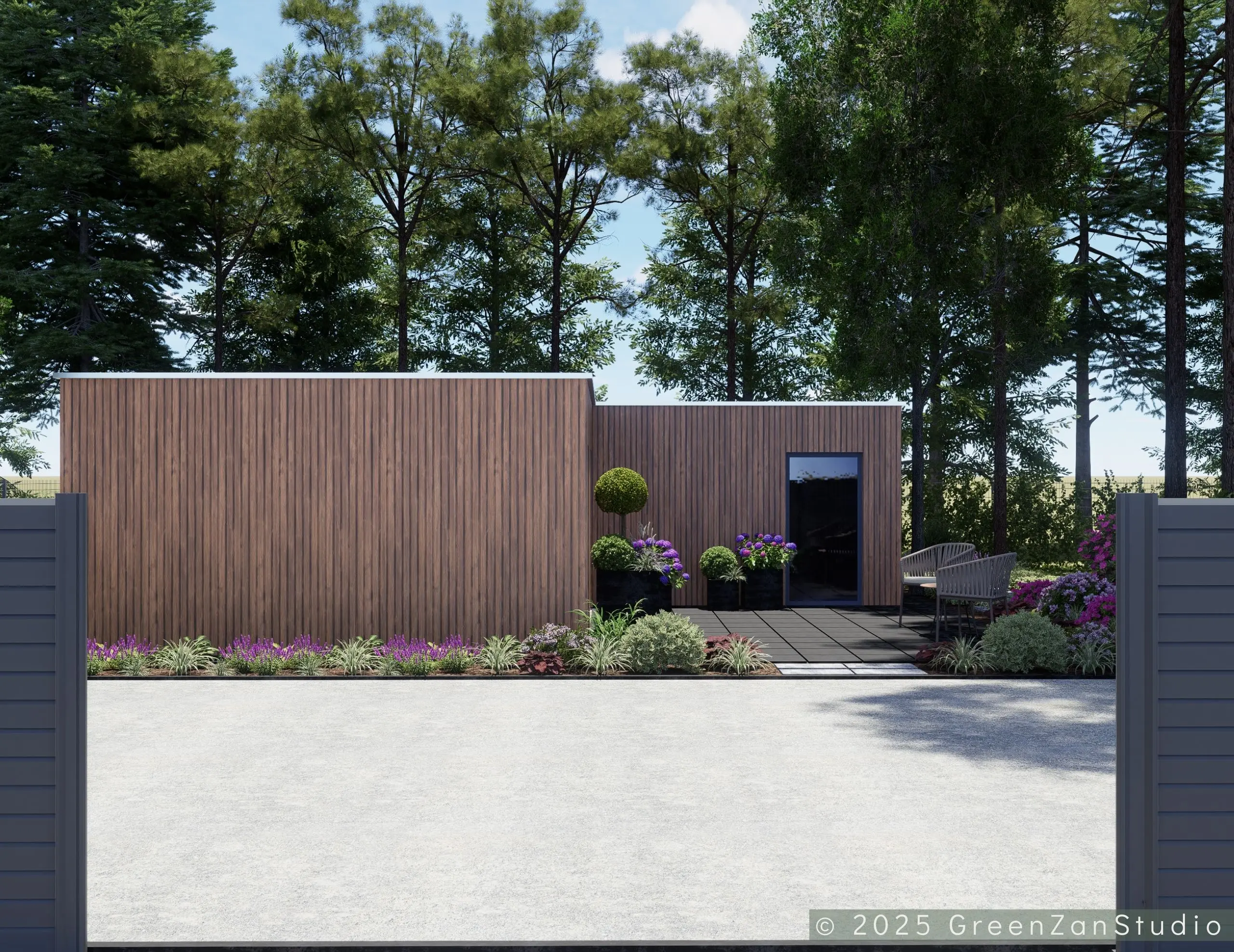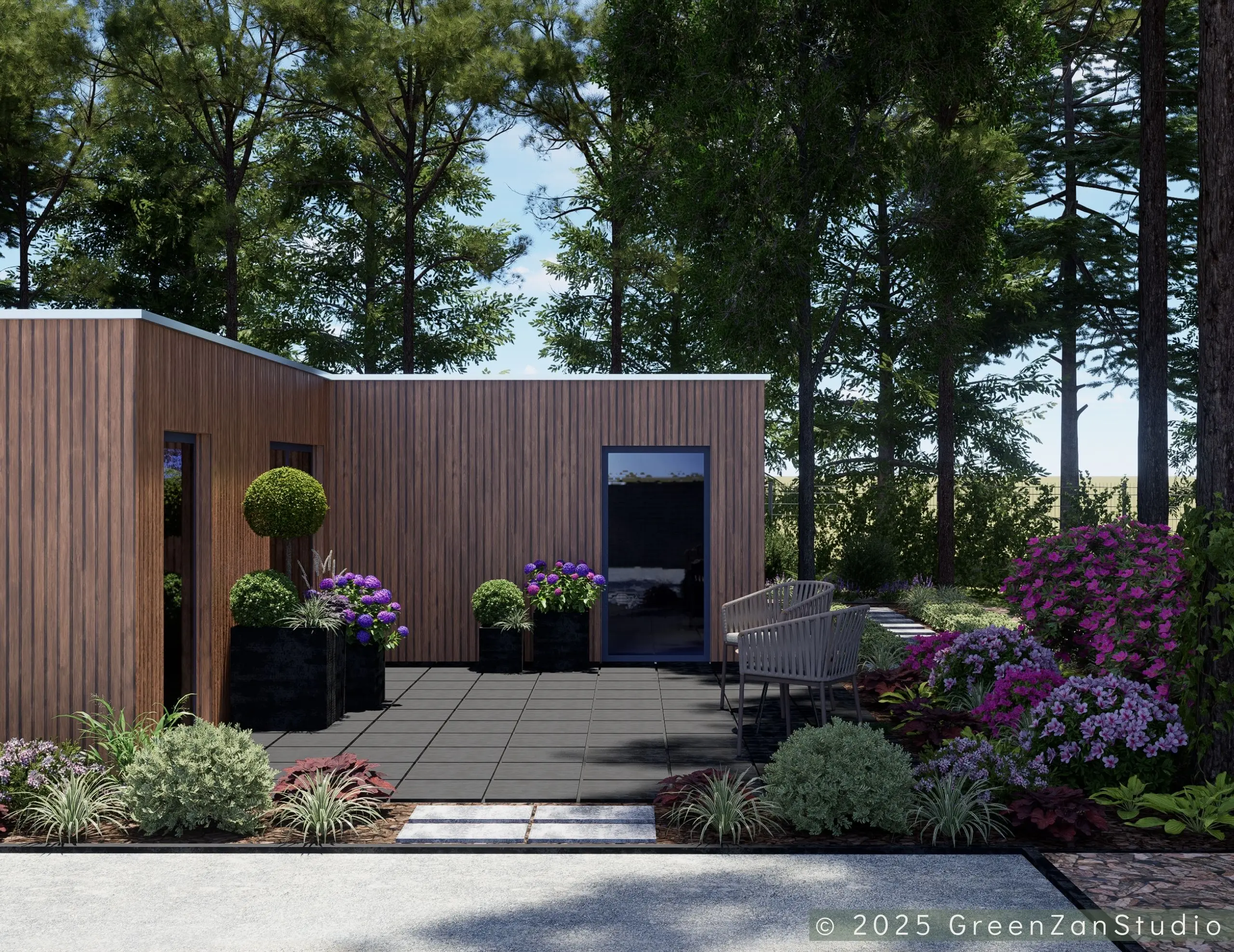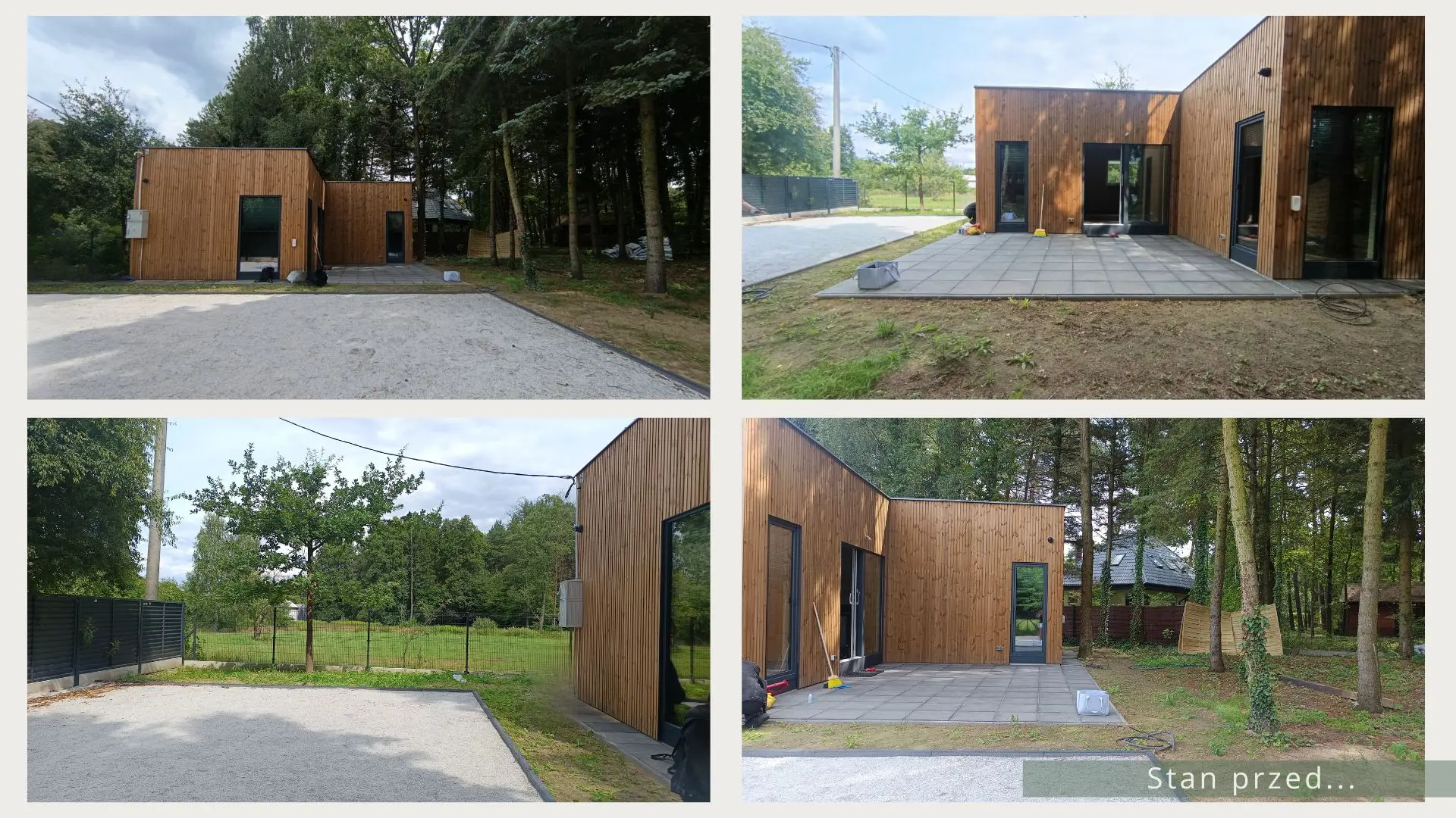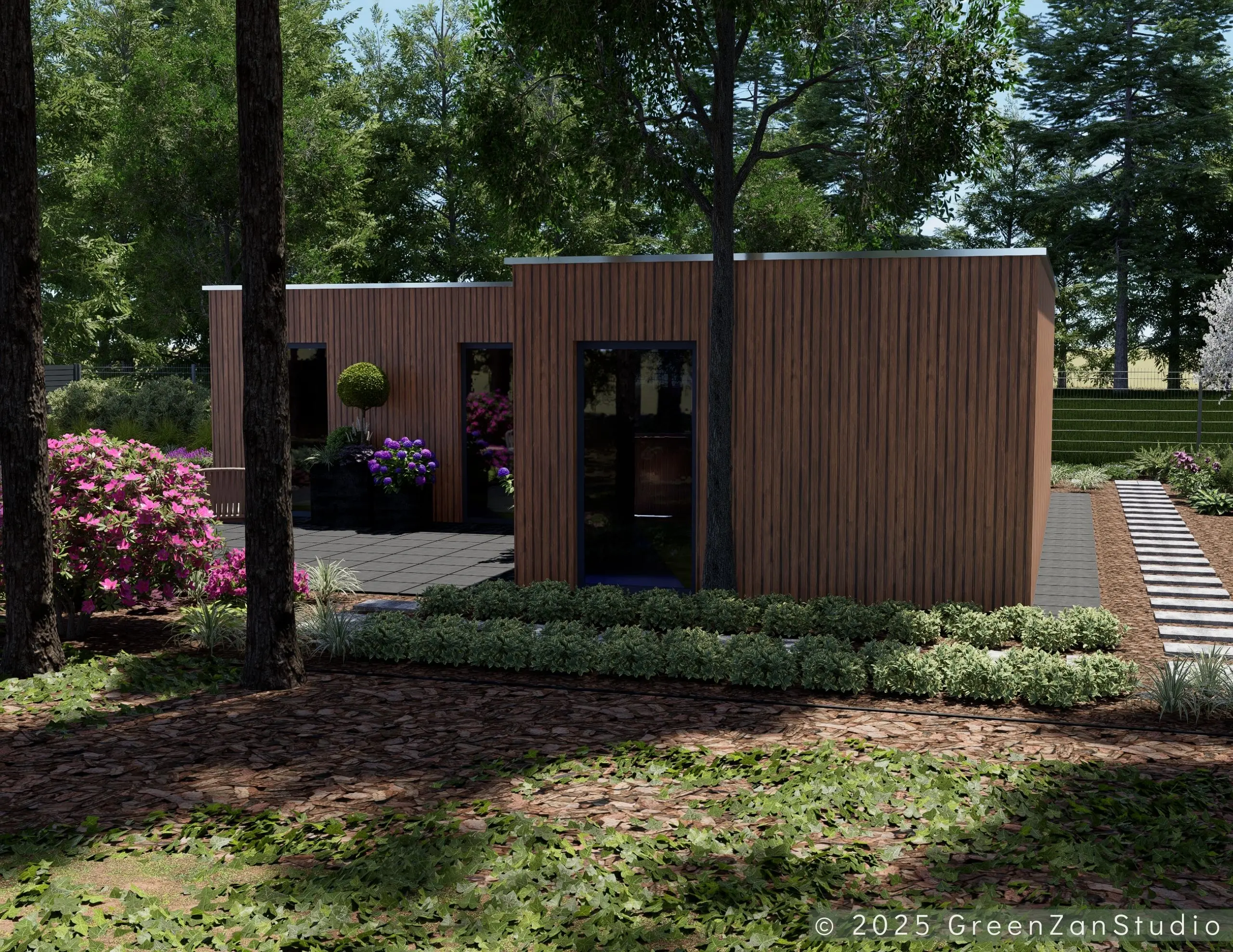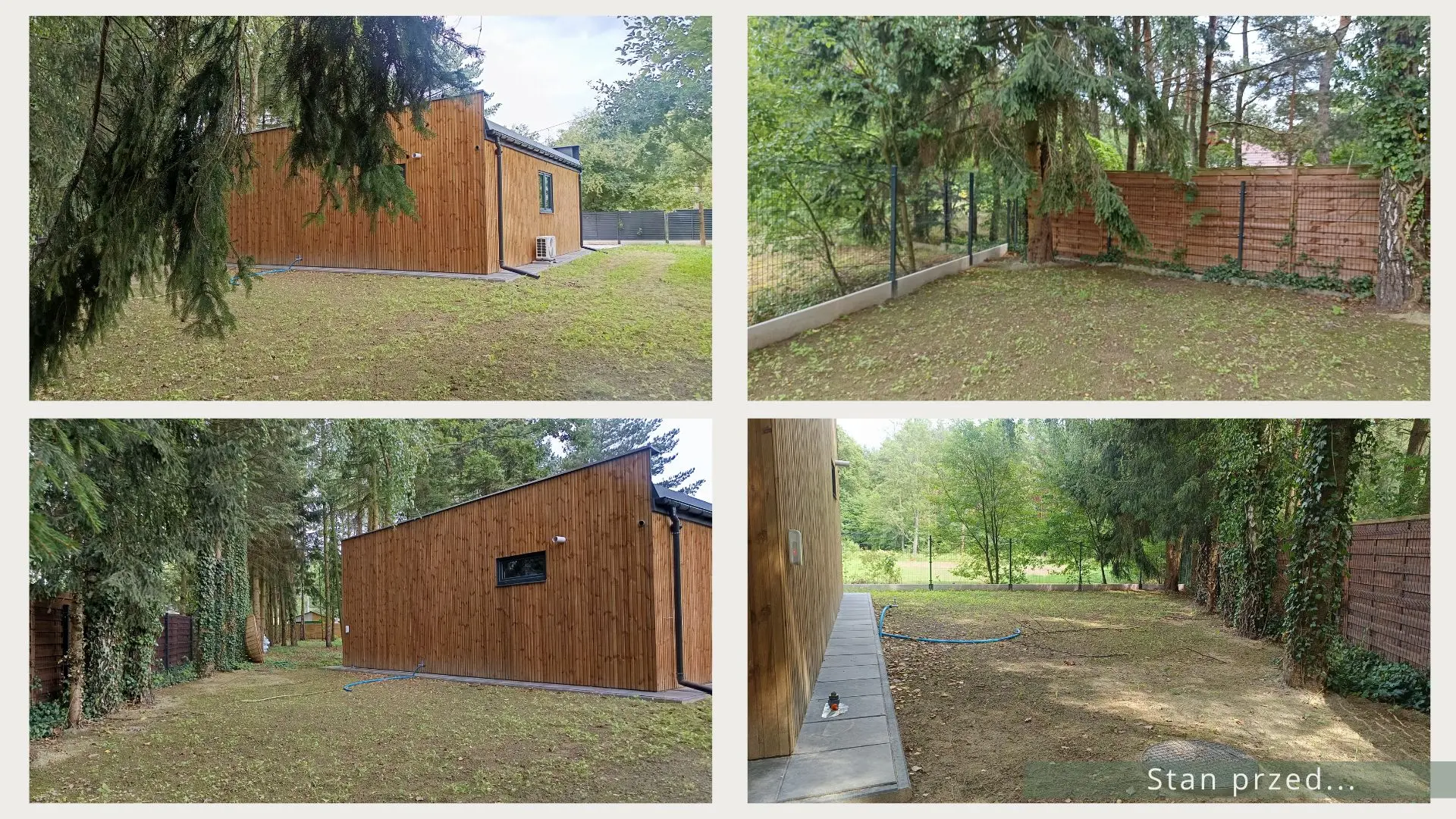 Projekt ogrodu nowoczesnego, leśnego o powierzchni około 210 m². W tym projekcie skupiono się na stworzeniu strefy tranzytowej wokół nowoczesnego budynku mieszkalnego. Zaprojektowano płyty betonowe układane na krok, zatopione w roślinności z wypełnieniem przestrzeni korą iglastą. Ze względu na duże zacienienie zrezygnowano z trawnika na rzecz rabat leśnych z gatunkami okrywowymi. Wydzielono strefę reprezentacyjną — rabatę przy tarasie wejściowym, w której dobrano rośliny wrzosowate, kwitnące oraz cieniolubne. W strefie tranzytowej, najbardziej nasłonecznionej, zaprojektowano krzewy owocowe, m.in. borówki i maliny. Całość harmonijnie współgra z otaczającym klimatem leśnym, wzbogaconym o subtelny akcent nowoczesności.