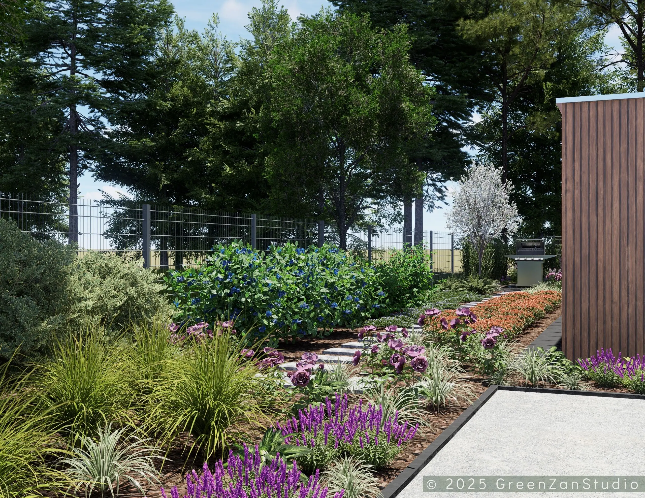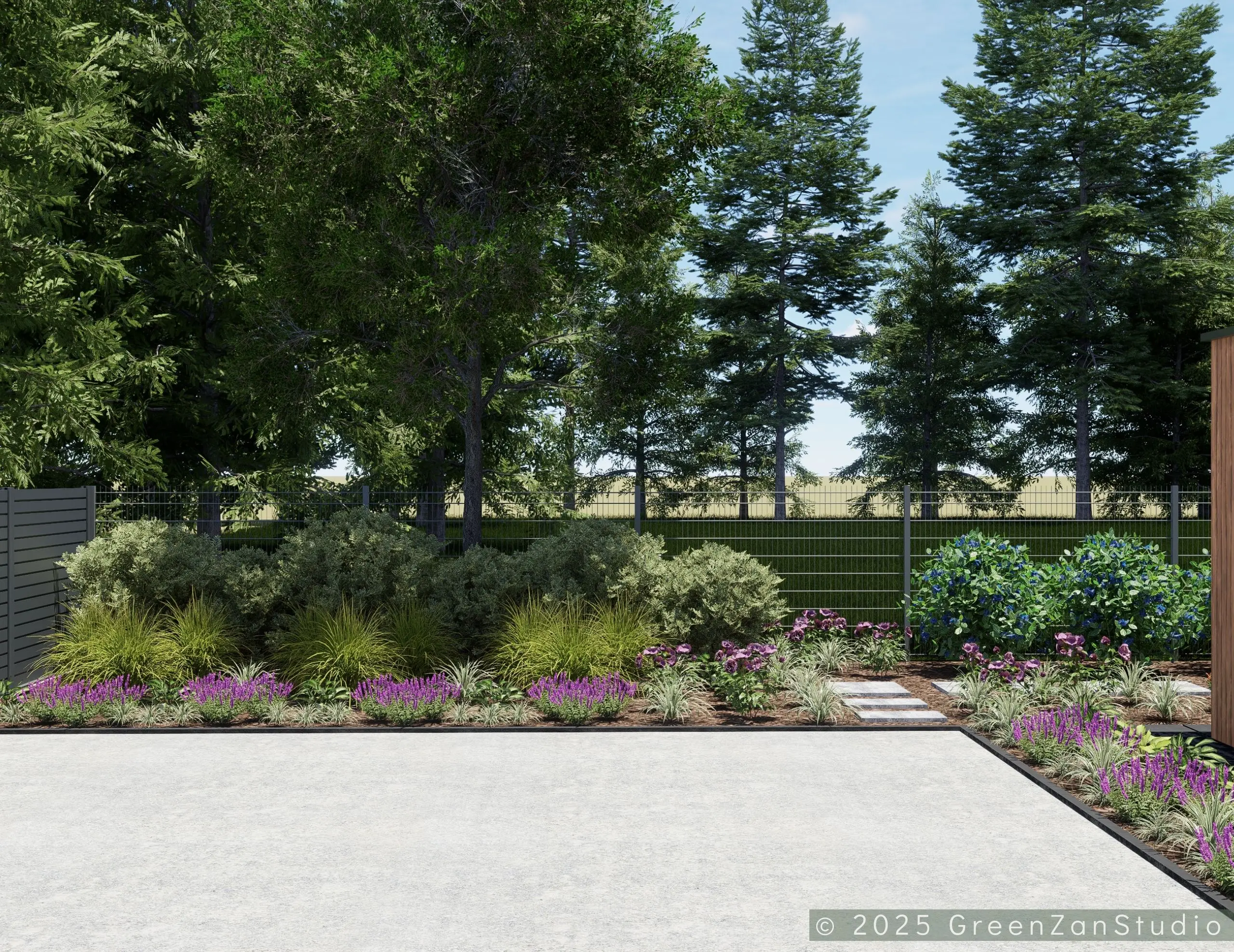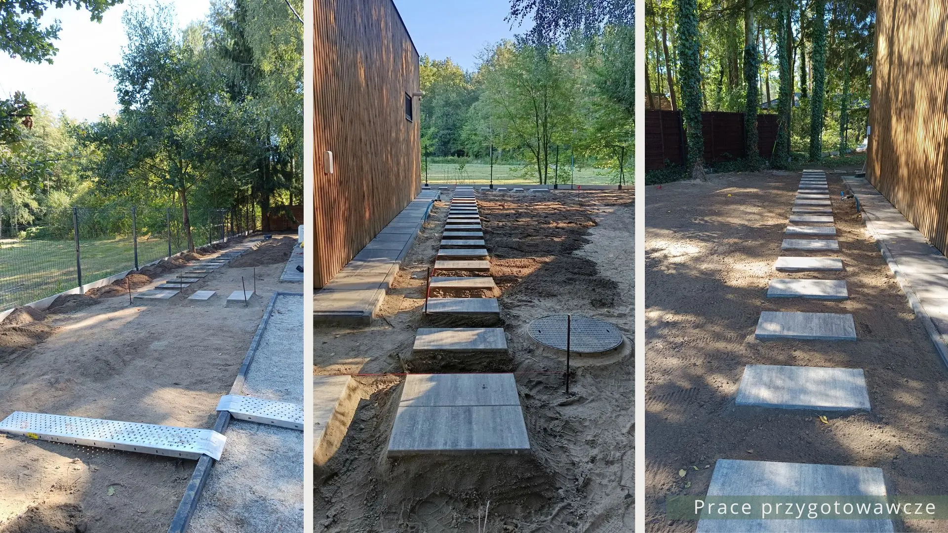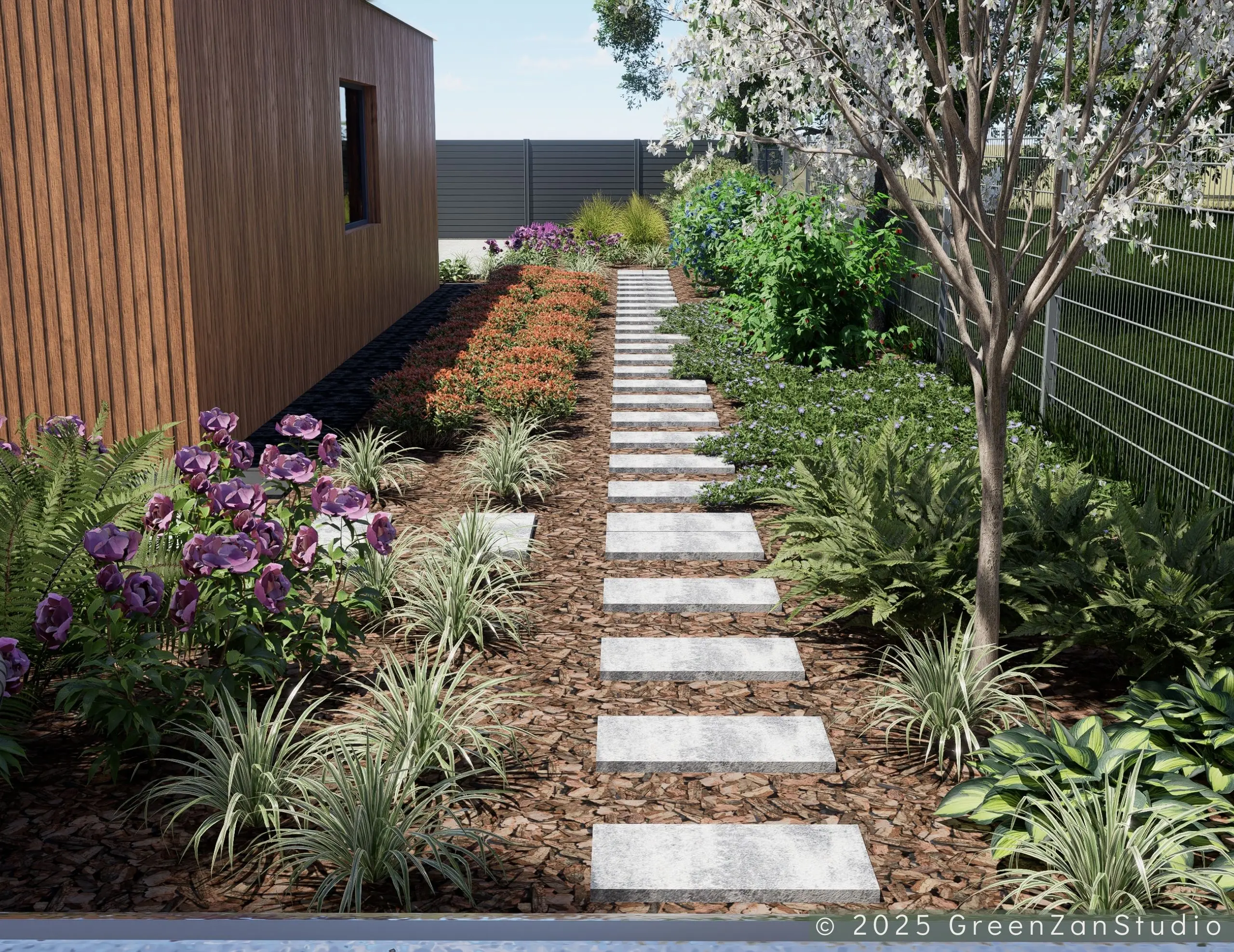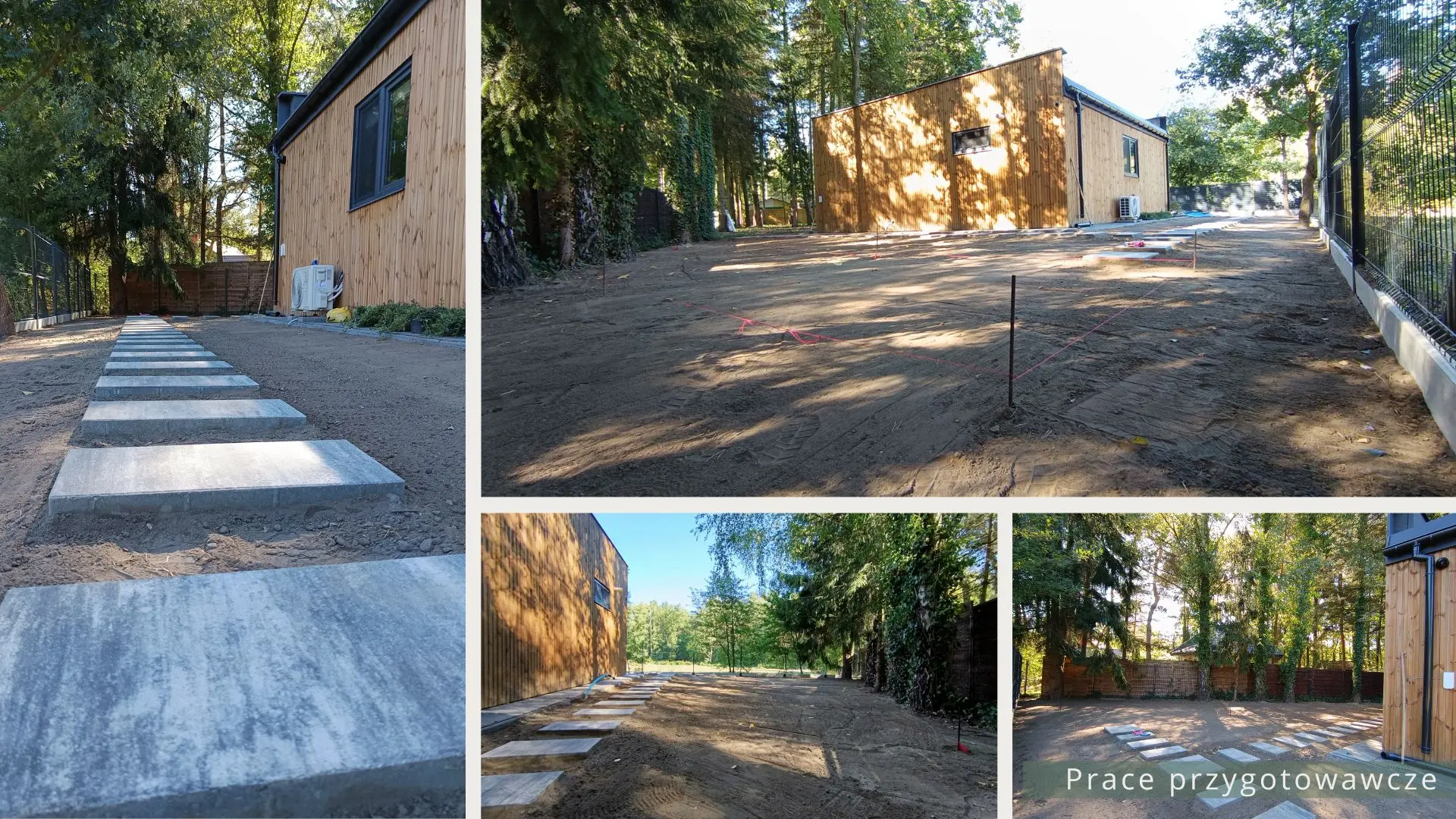 Projekt ogrodu nowoczesnego, leśnego o powierzchni około 210 m². W tym projekcie skupiono się na stworzeniu strefy tranzytowej wokół nowoczesnego budynku mieszkalnego. Zaprojektowano płyty betonowe układane na krok, zatopione w roślinności z wypełnieniem przestrzeni korą iglastą. Ze względu na duże zacienienie zrezygnowano z trawnika na rzecz rabat leśnych z gatunkami okrywowymi. Wydzielono strefę reprezentacyjną — rabatę przy tarasie wejściowym, w której dobrano rośliny wrzosowate, kwitnące oraz cieniolubne. W strefie tranzytowej, najbardziej nasłonecznionej, zaprojektowano krzewy owocowe, m.in. borówki i maliny. Całość harmonijnie współgra z otaczającym klimatem leśnym, wzbogaconym o subtelny akcent nowoczesności.