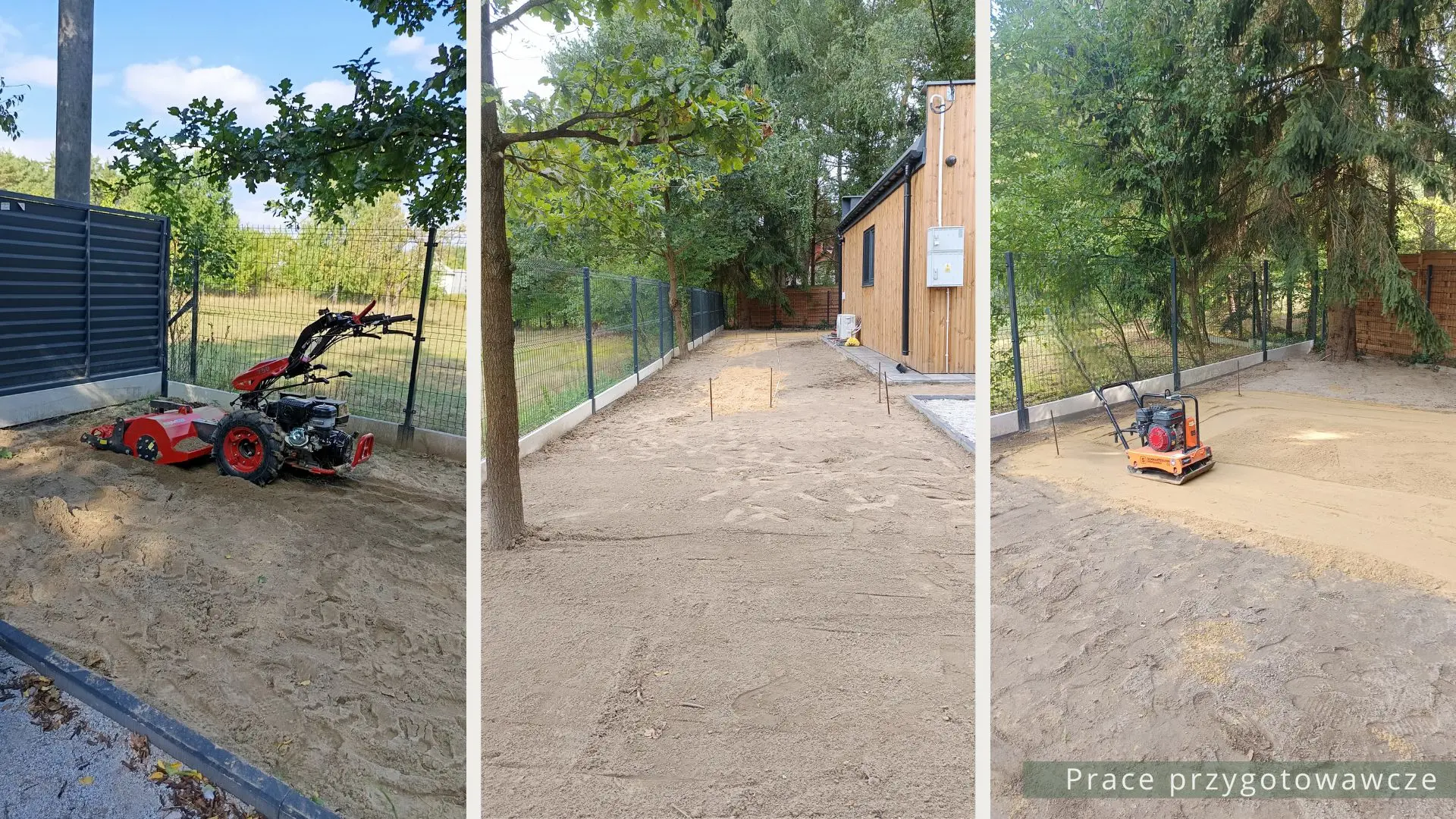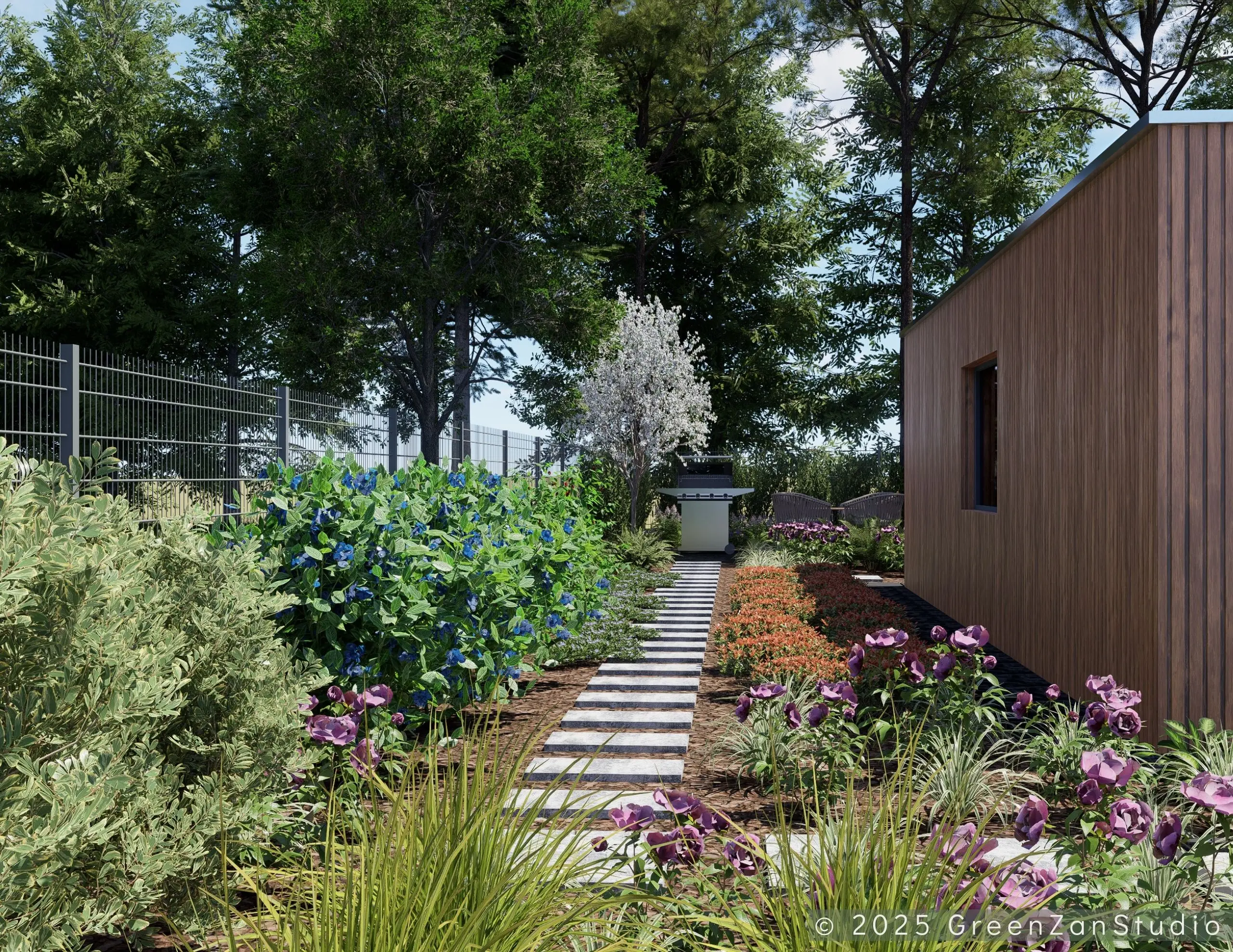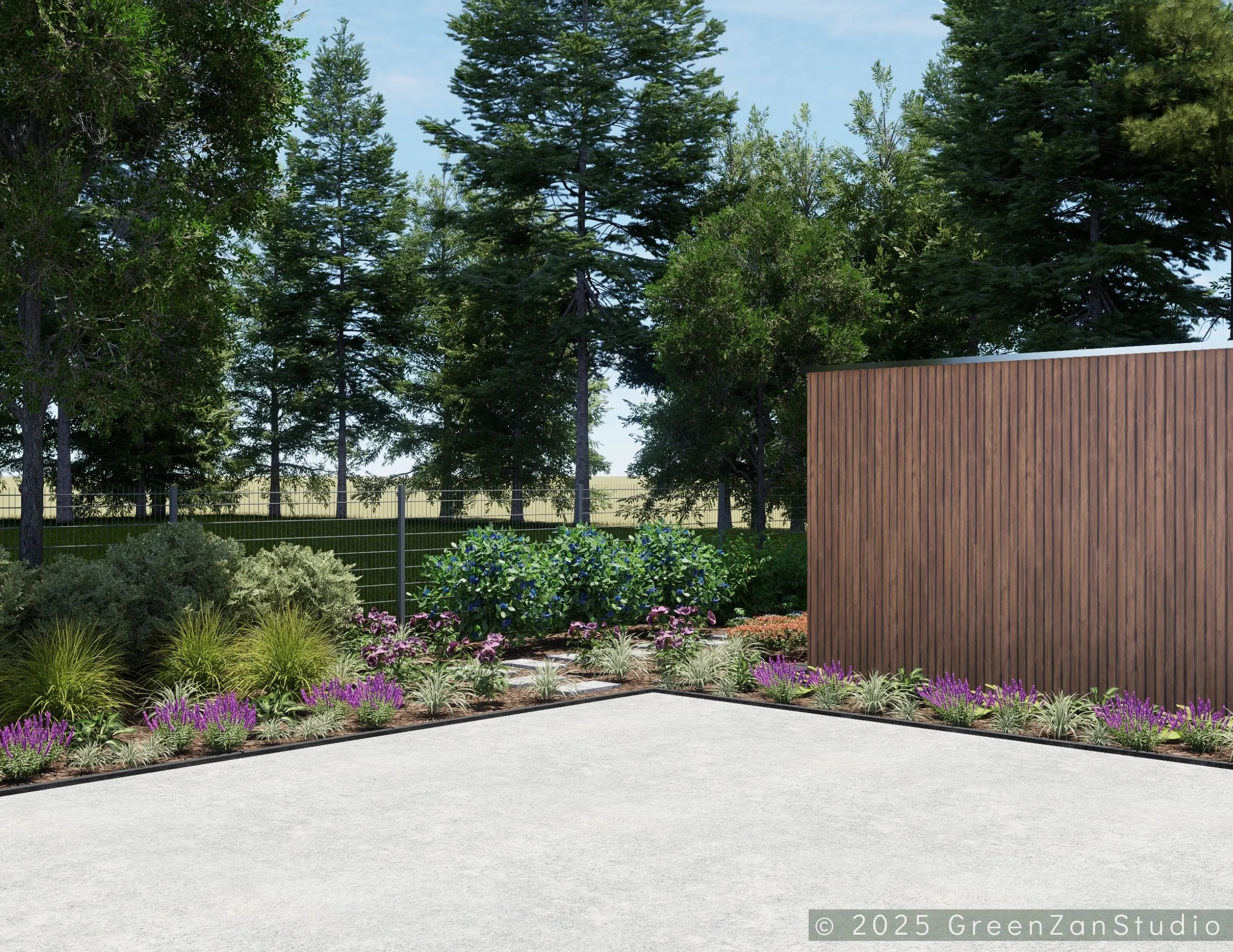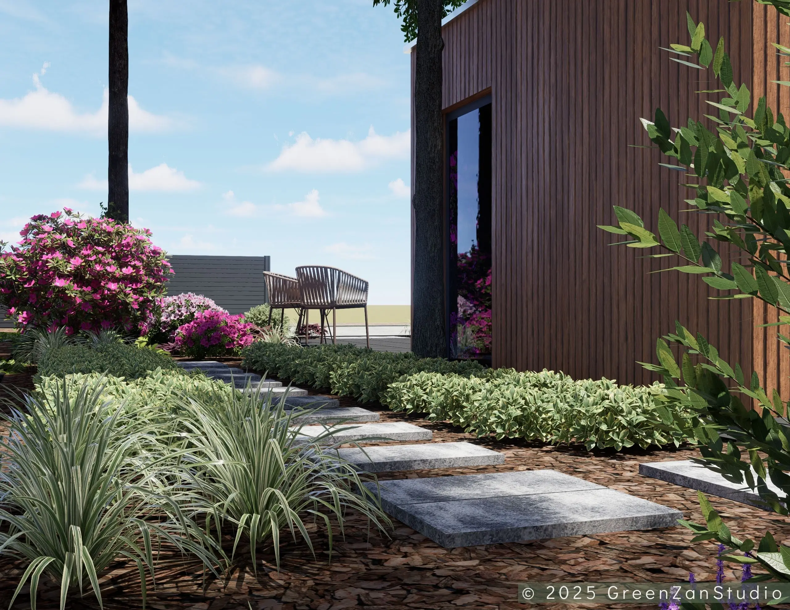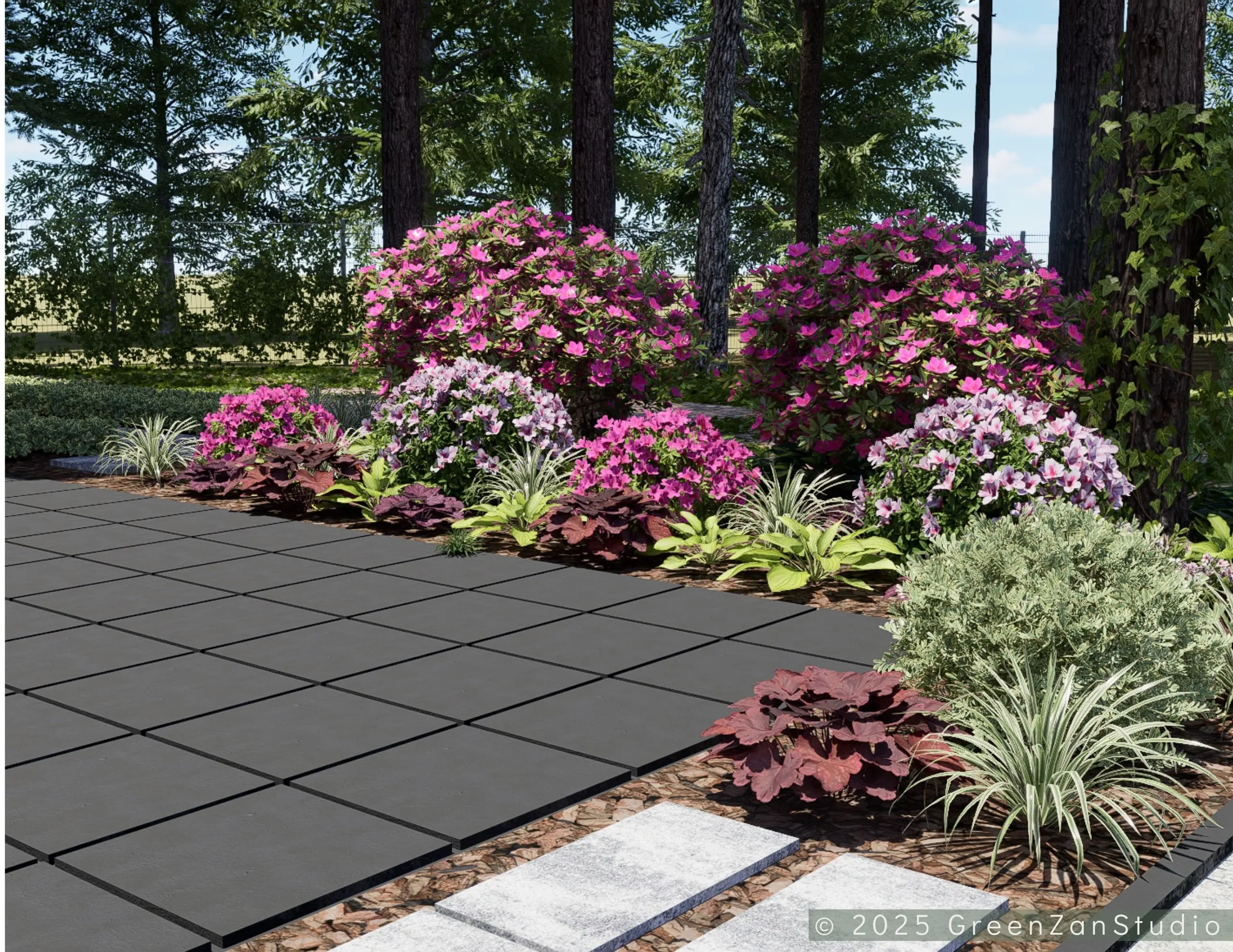 Projekt ogrodu nowoczesnego, leśnego o powierzchni około 210 m². W tym projekcie skupiono się na stworzeniu strefy tranzytowej wokół nowoczesnego budynku mieszkalnego. Zaprojektowano płyty betonowe układane na krok, zatopione w roślinności z wypełnieniem przestrzeni korą iglastą. Ze względu na duże zacienienie zrezygnowano z trawnika na rzecz rabat leśnych z gatunkami okrywowymi. Wydzielono strefę reprezentacyjną — rabatę przy tarasie wejściowym, w której dobrano rośliny wrzosowate, kwitnące oraz cieniolubne. W strefie tranzytowej, najbardziej nasłonecznionej, zaprojektowano krzewy owocowe, m.in. borówki i maliny. Całość harmonijnie współgra z otaczającym klimatem leśnym, wzbogaconym o subtelny akcent nowoczesności.