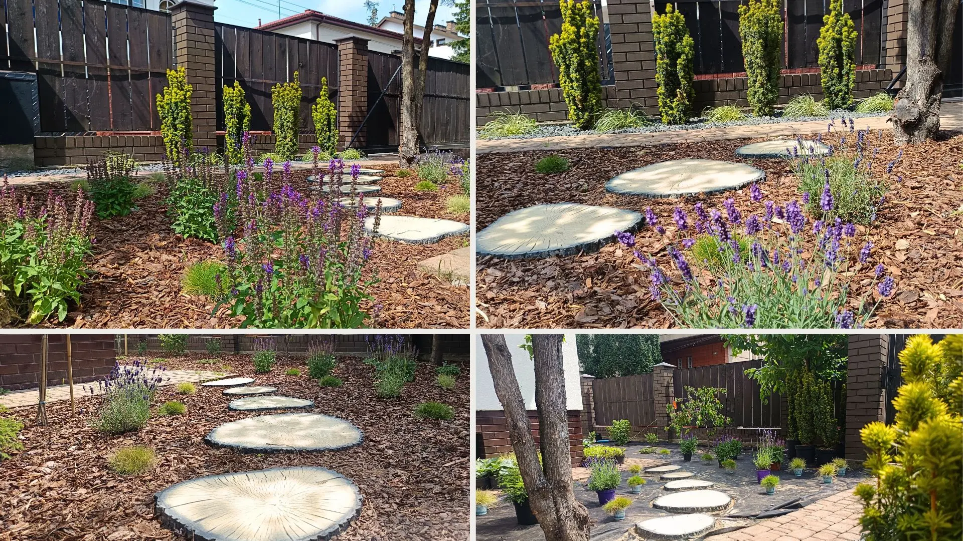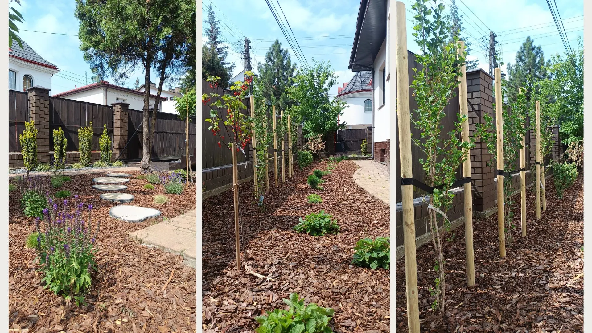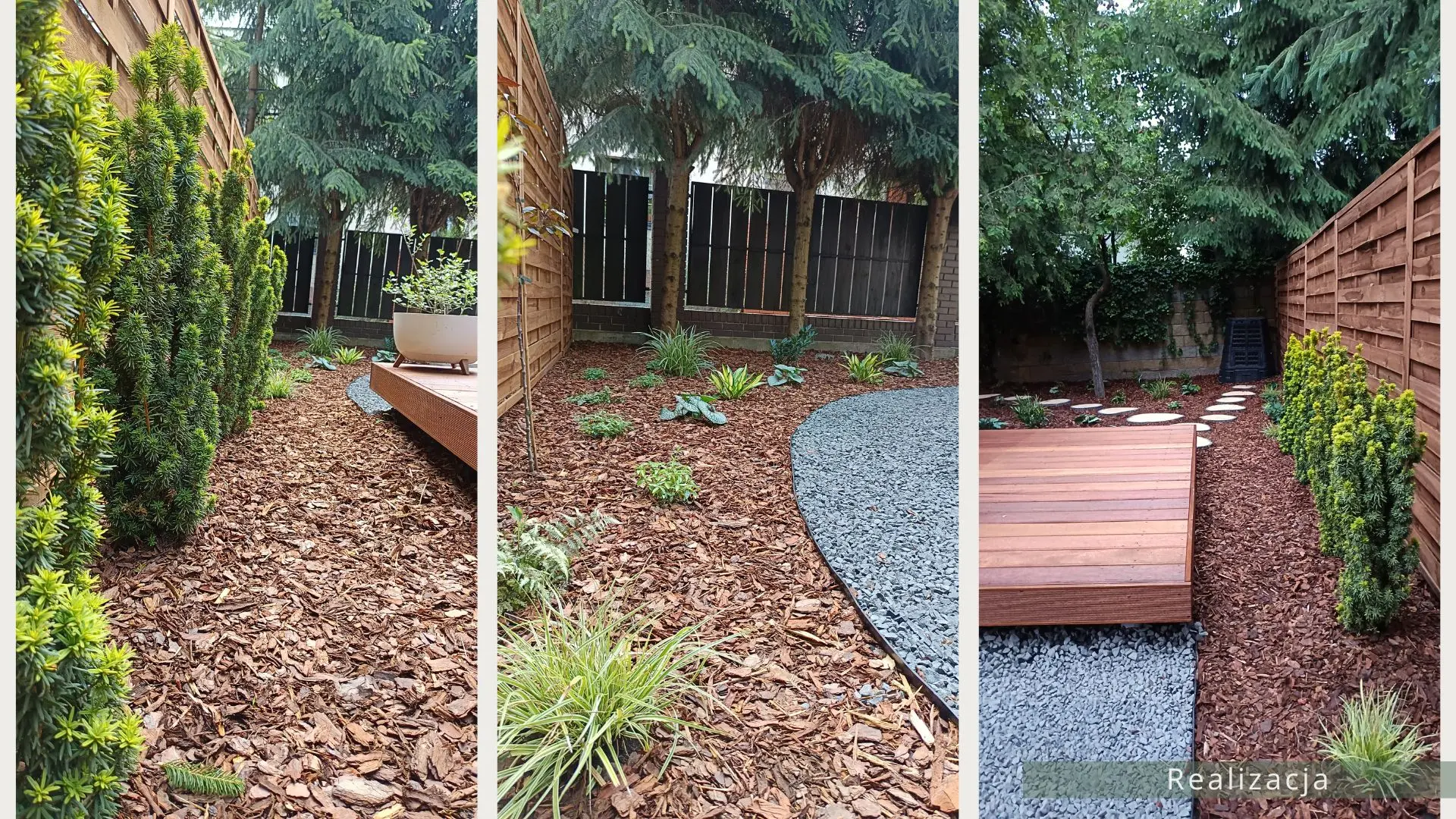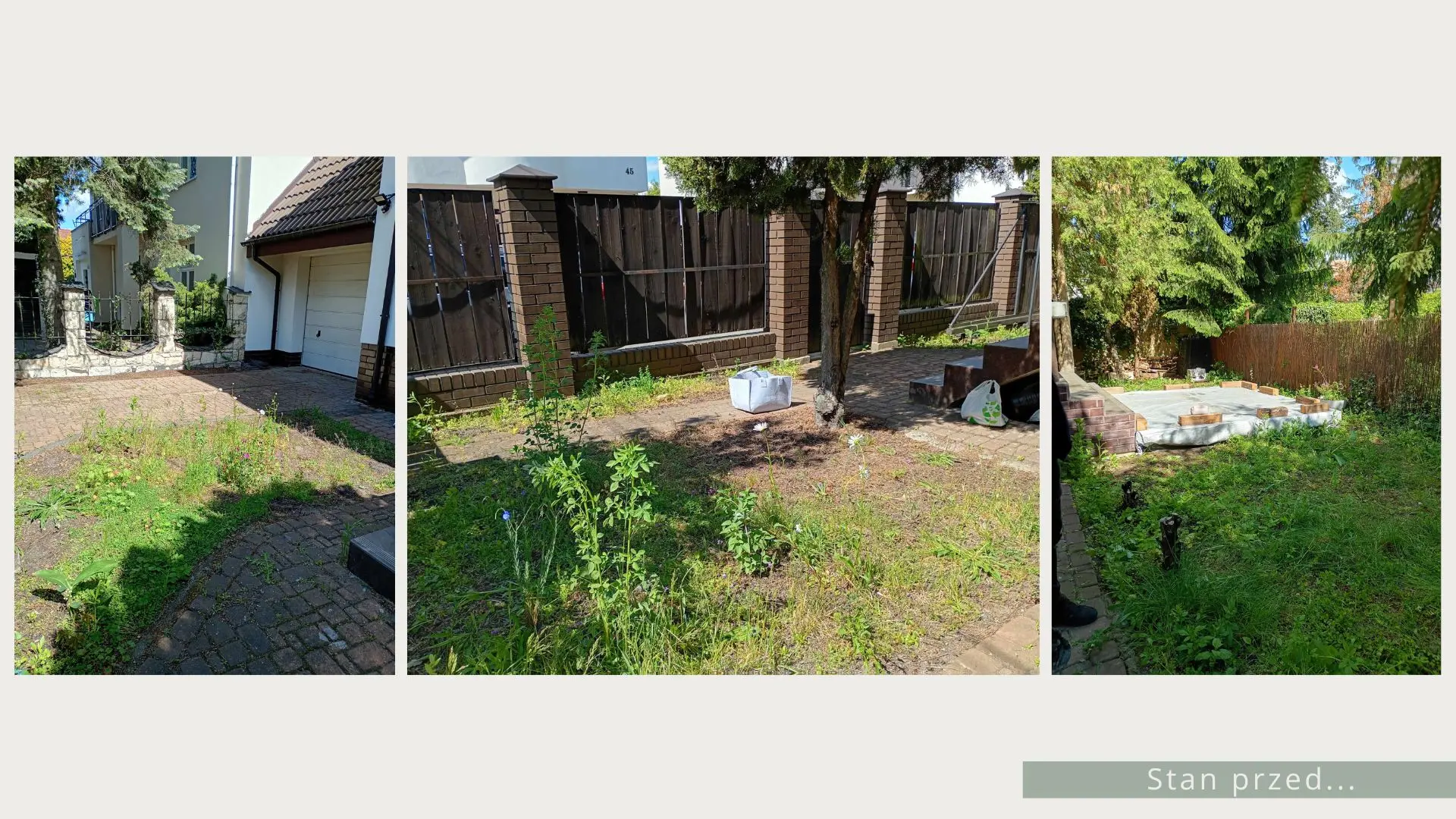 Projekt ogrodu naturalistycznego o powierzchni około 140 m². Głównym założeniem było zastosowanie materiałów o naturalnym charakterze, takich jak płyty betonowe imitujące drewno oraz otoczenie bogate w roślinność kwitnącą. Ogród został podzielony na trzy strefy. Pierwsza – wejściowa, reprezentacyjna – wykorzystuje kamień ozdobny. Druga – tranzytowa – pełni funkcję przestrzeni przejściowej; posadzono tu drzewa kolumnowe zasłaniające widok na sąsiednie posesje oraz przewidziano miejsce na rośliny owocowe i warzywnik. Trzecia strefa to część wypoczynkowa, połączona z tarasem. Powiększono ją o żwirowy plac wykonany na podbudowie, stanowiący dodatkową strefę relaksu. W części zacienionej dobrano gatunki cieniolubne, tworzące spójny, naturalistyczny charakter ogrodu.