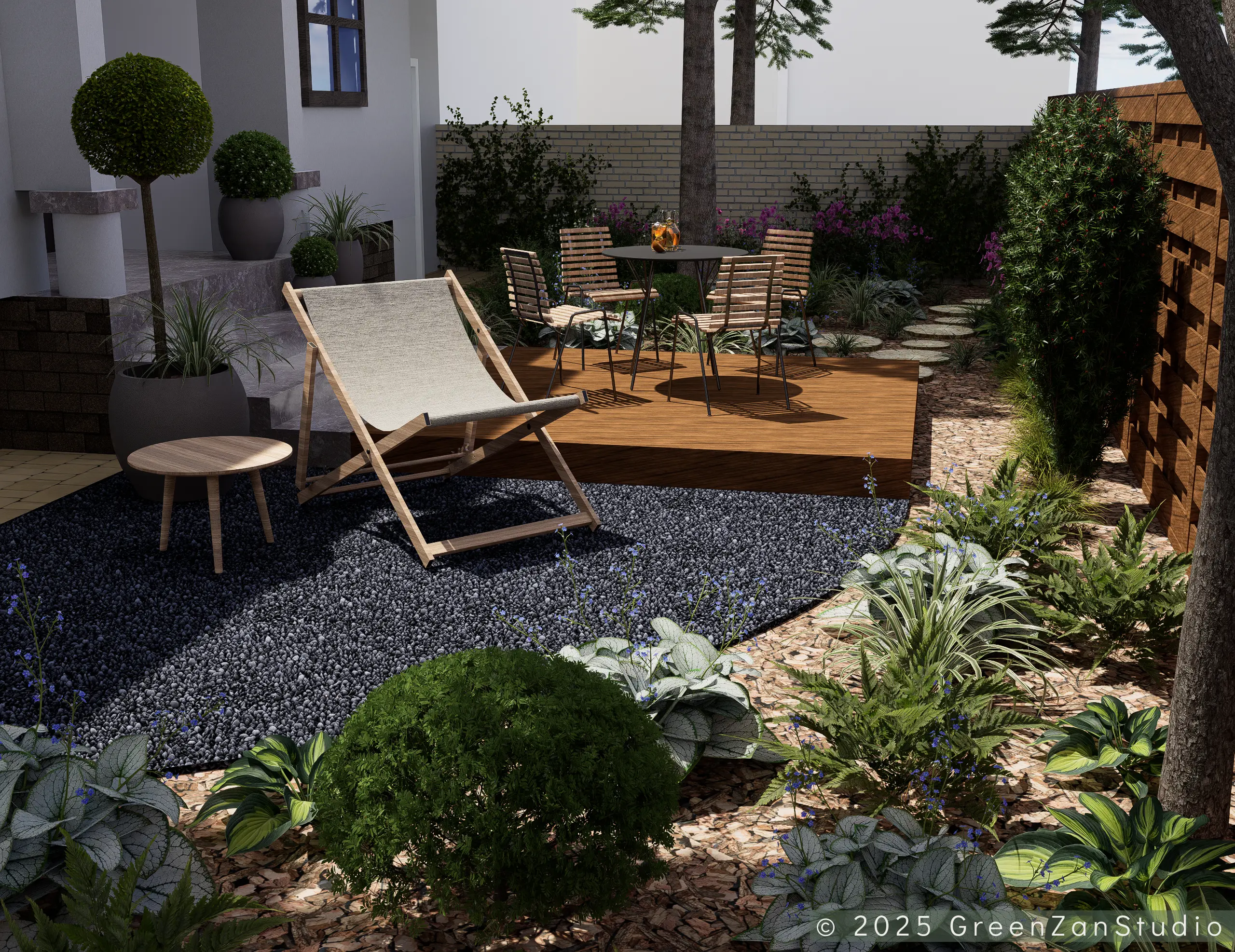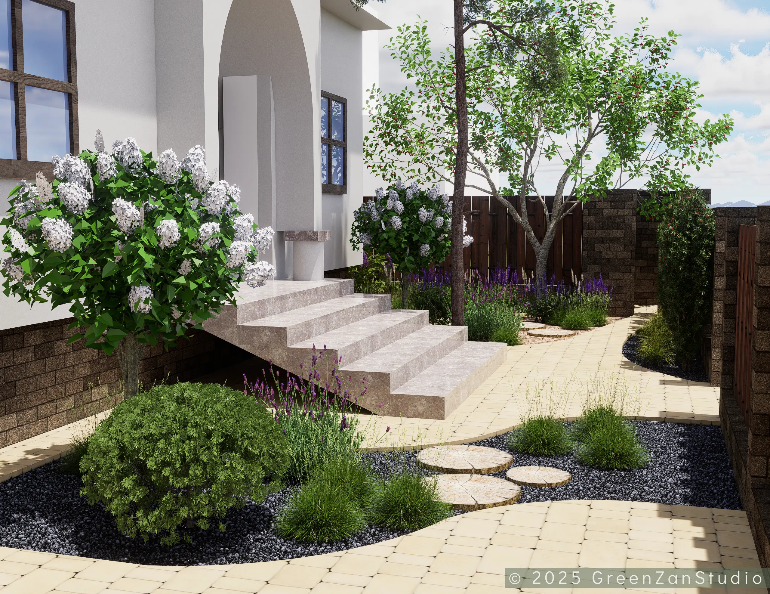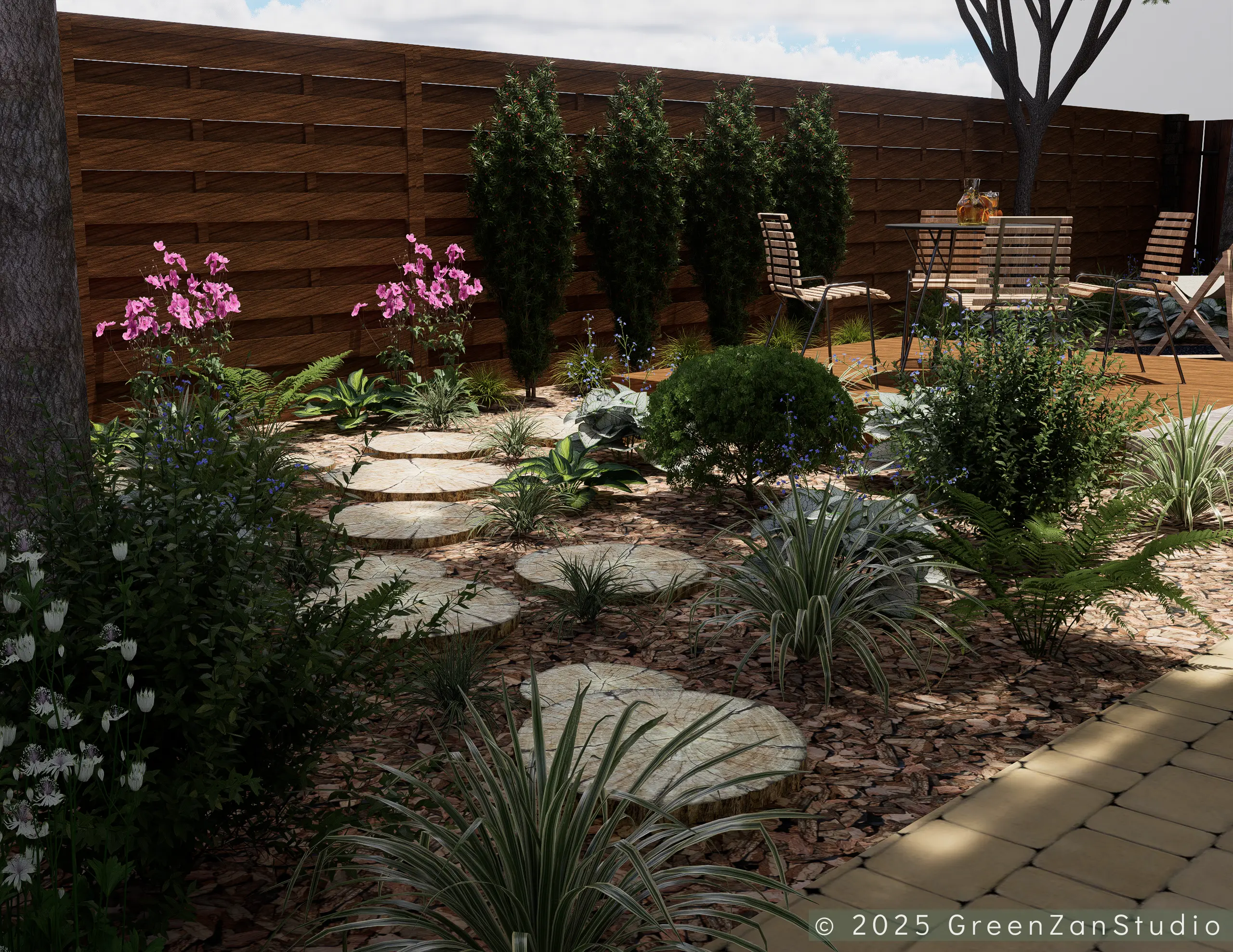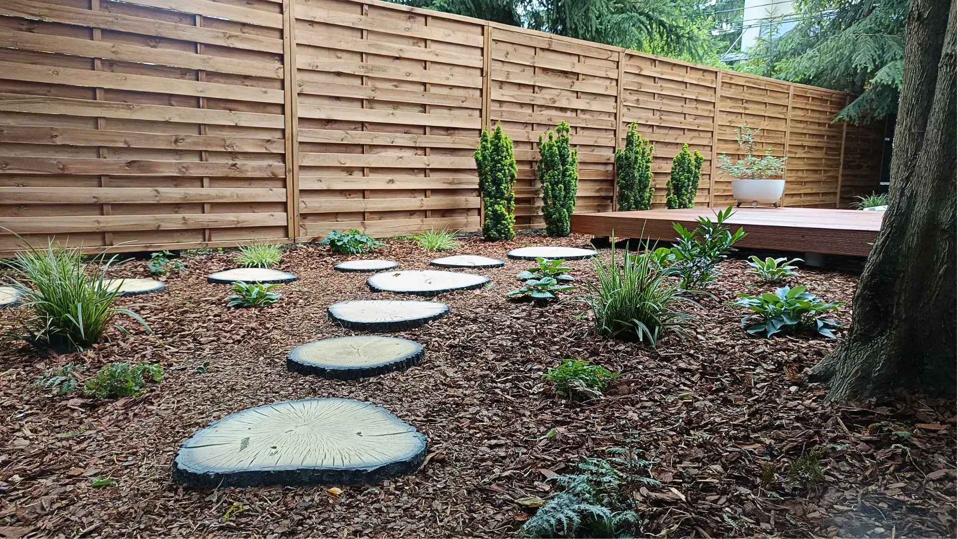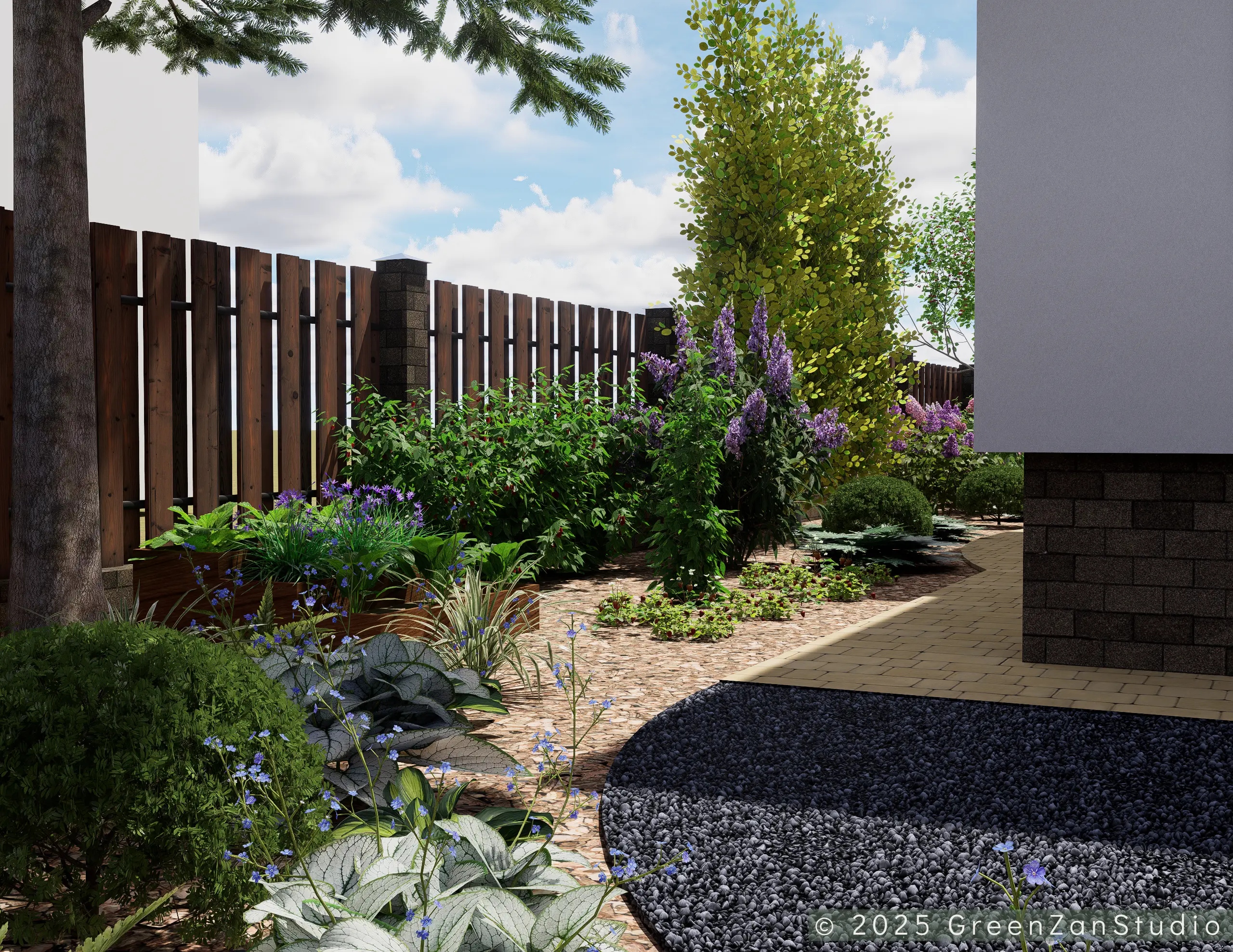 Projekt ogrodu naturalistycznego o powierzchni około 140 m². Głównym założeniem było zastosowanie materiałów o naturalnym charakterze, takich jak płyty betonowe imitujące drewno oraz otoczenie bogate w roślinność kwitnącą. Ogród został podzielony na trzy strefy. Pierwsza – wejściowa, reprezentacyjna – wykorzystuje kamień ozdobny. Druga – tranzytowa – pełni funkcję przestrzeni przejściowej; posadzono tu drzewa kolumnowe zasłaniające widok na sąsiednie posesje oraz przewidziano miejsce na rośliny owocowe i warzywnik. Trzecia strefa to część wypoczynkowa, połączona z tarasem. Powiększono ją o żwirowy plac wykonany na podbudowie, stanowiący dodatkową strefę relaksu. W części zacienionej dobrano gatunki cieniolubne, tworzące spójny, naturalistyczny charakter ogrodu.