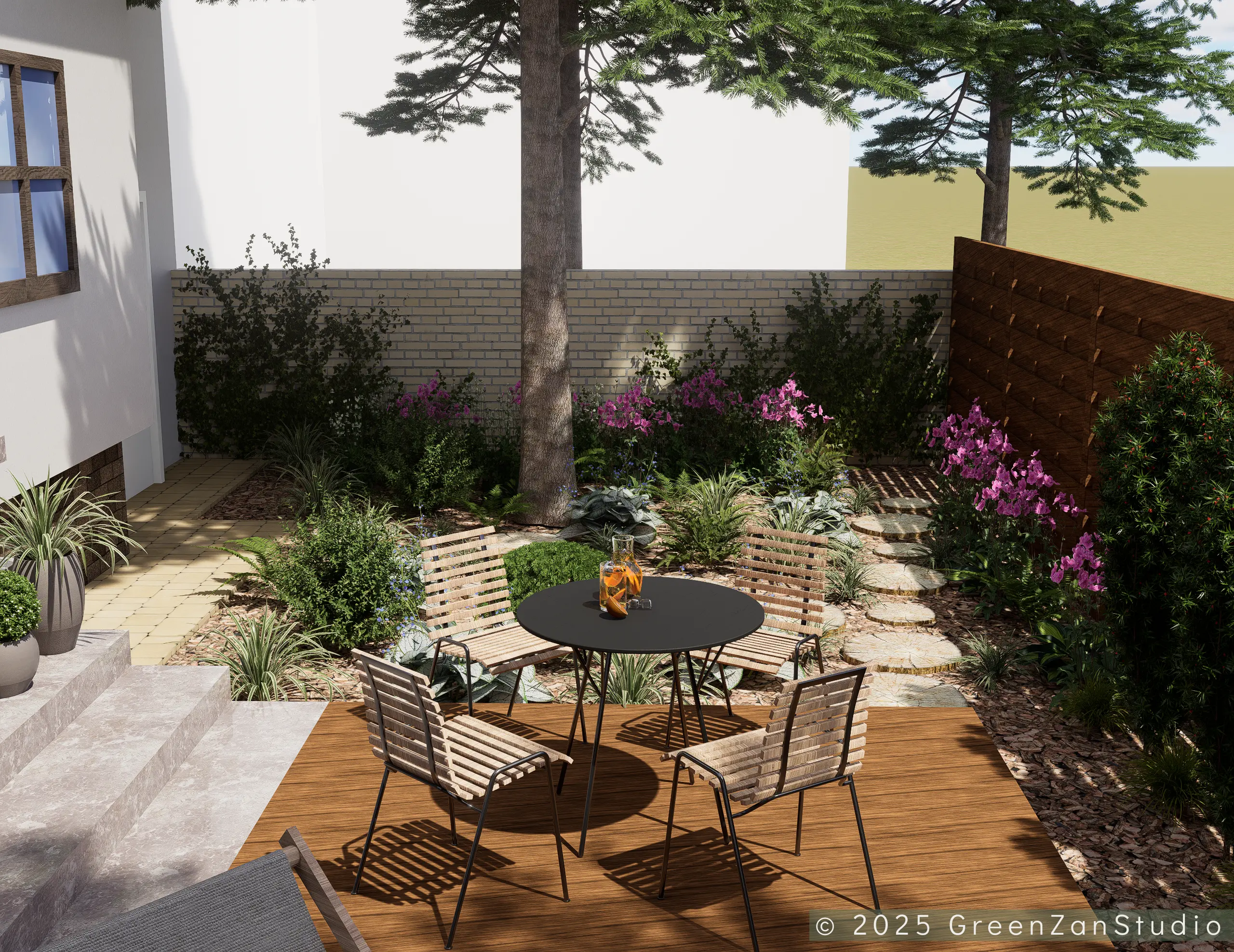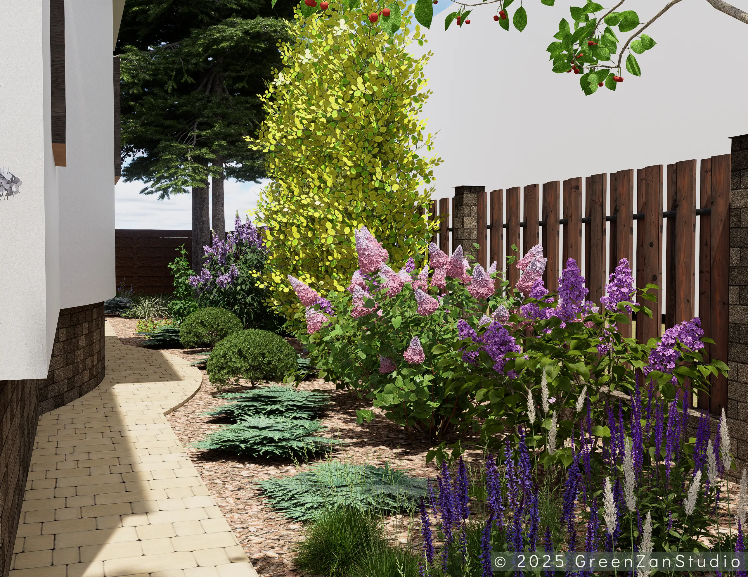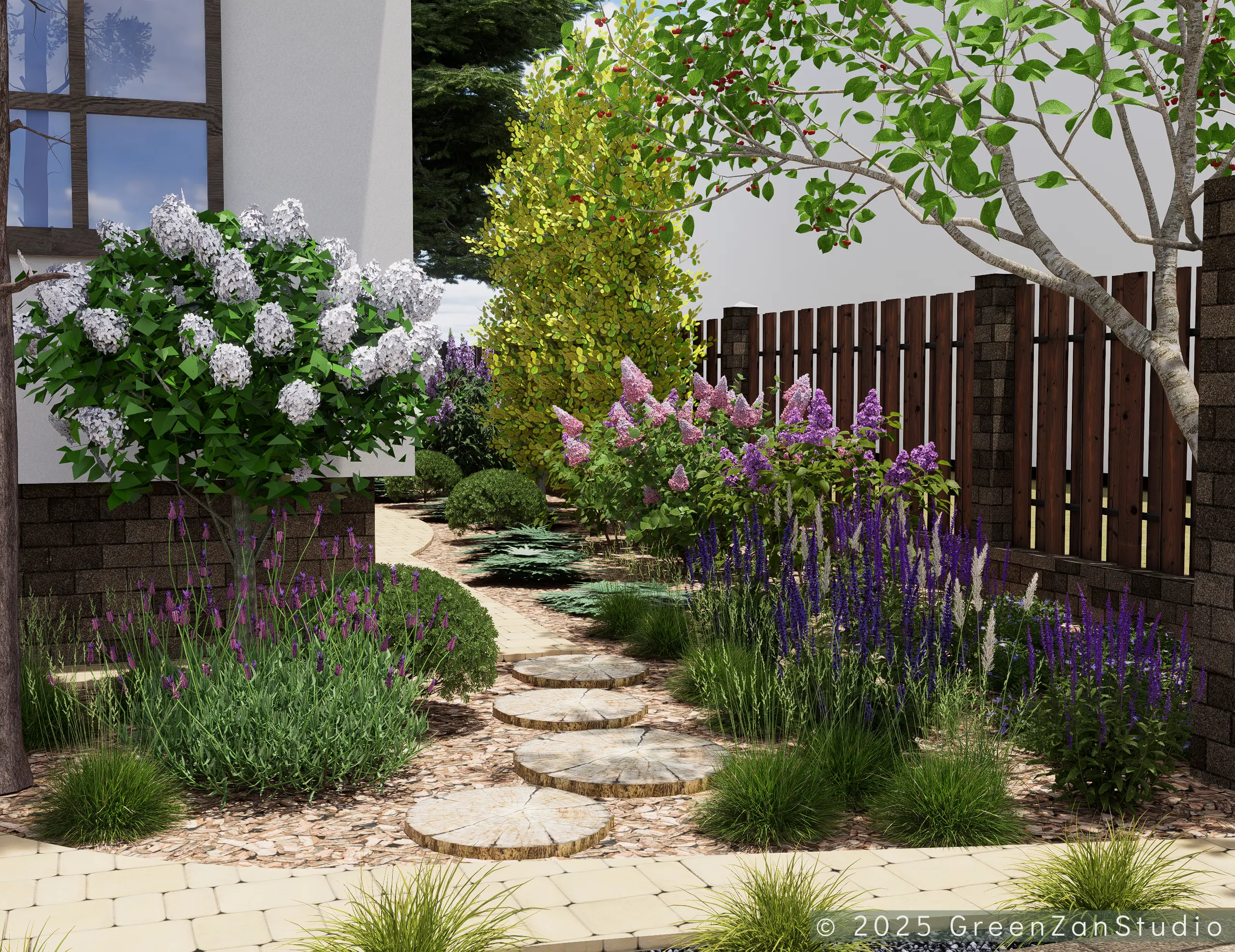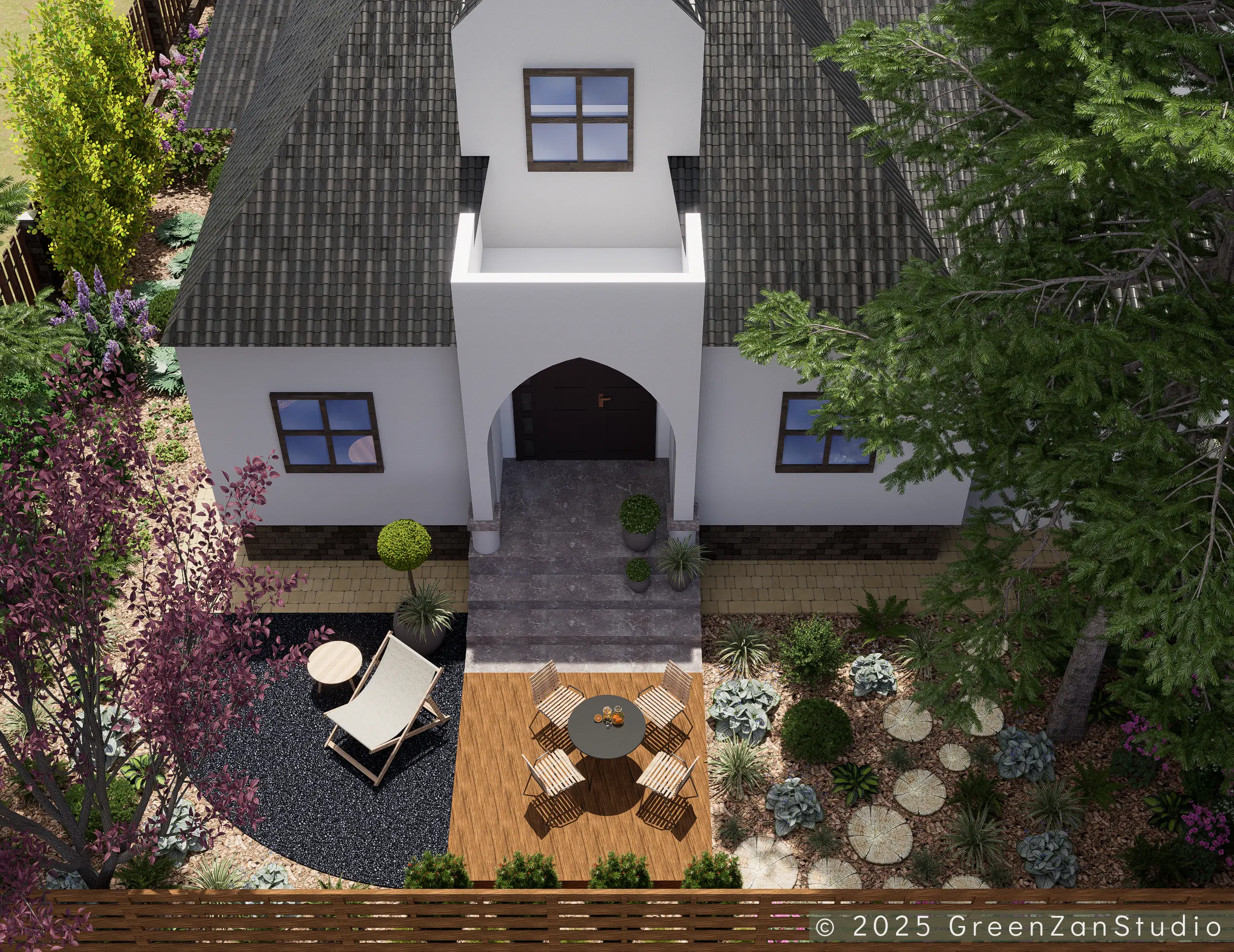 Projekt ogrodu naturalistycznego o powierzchni około 140 m². Głównym założeniem było zastosowanie materiałów o naturalnym charakterze, takich jak płyty betonowe imitujące drewno oraz otoczenie bogate w roślinność kwitnącą. Ogród został podzielony na trzy strefy. Pierwsza – wejściowa, reprezentacyjna – wykorzystuje kamień ozdobny. Druga – tranzytowa – pełni funkcję przestrzeni przejściowej; posadzono tu drzewa kolumnowe zasłaniające widok na sąsiednie posesje oraz przewidziano miejsce na rośliny owocowe i warzywnik. Trzecia strefa to część wypoczynkowa, połączona z tarasem. Powiększono ją o żwirowy plac wykonany na podbudowie, stanowiący dodatkową strefę relaksu. W części zacienionej dobrano gatunki cieniolubne, tworzące spójny, naturalistyczny charakter ogrodu.